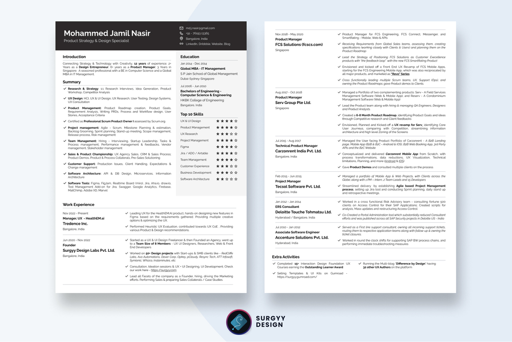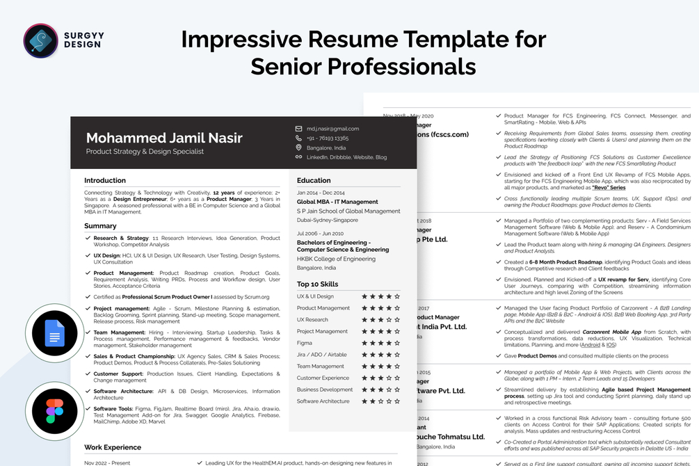 Our Resume layout looks creative, alongside providing the right paragraph width for easier reading. A wider full width layout can get hard to read across tightly packed 2 bullet points. Our layout helps the reviewer skim through your resume faster & easier.